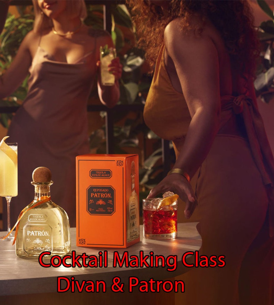 three signature Patron cocktails: Margarita, Paloma, and Diablo. Additionally, we will sample the Blanco, Reposado, Añejo, and Cristalino neat.
