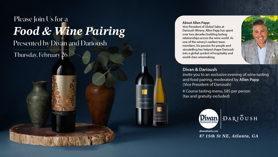 A 4-course tasting menu expertly paired with Darioush wines, moderated by Allen Papp, Vice President of Darioush Winery.